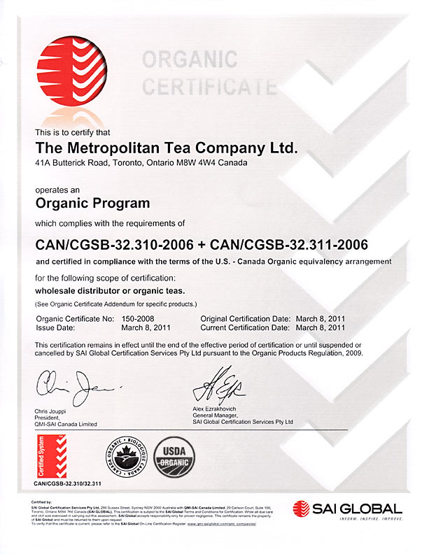 Metropolitan Tea is a CFIA COR Certified Organic Food Handler and Tea Supplier. All of our organic products are certified 100% organic and are grown with no conventional pesticides, petroleum based fertilizers or sewage-sludge fertilizers.